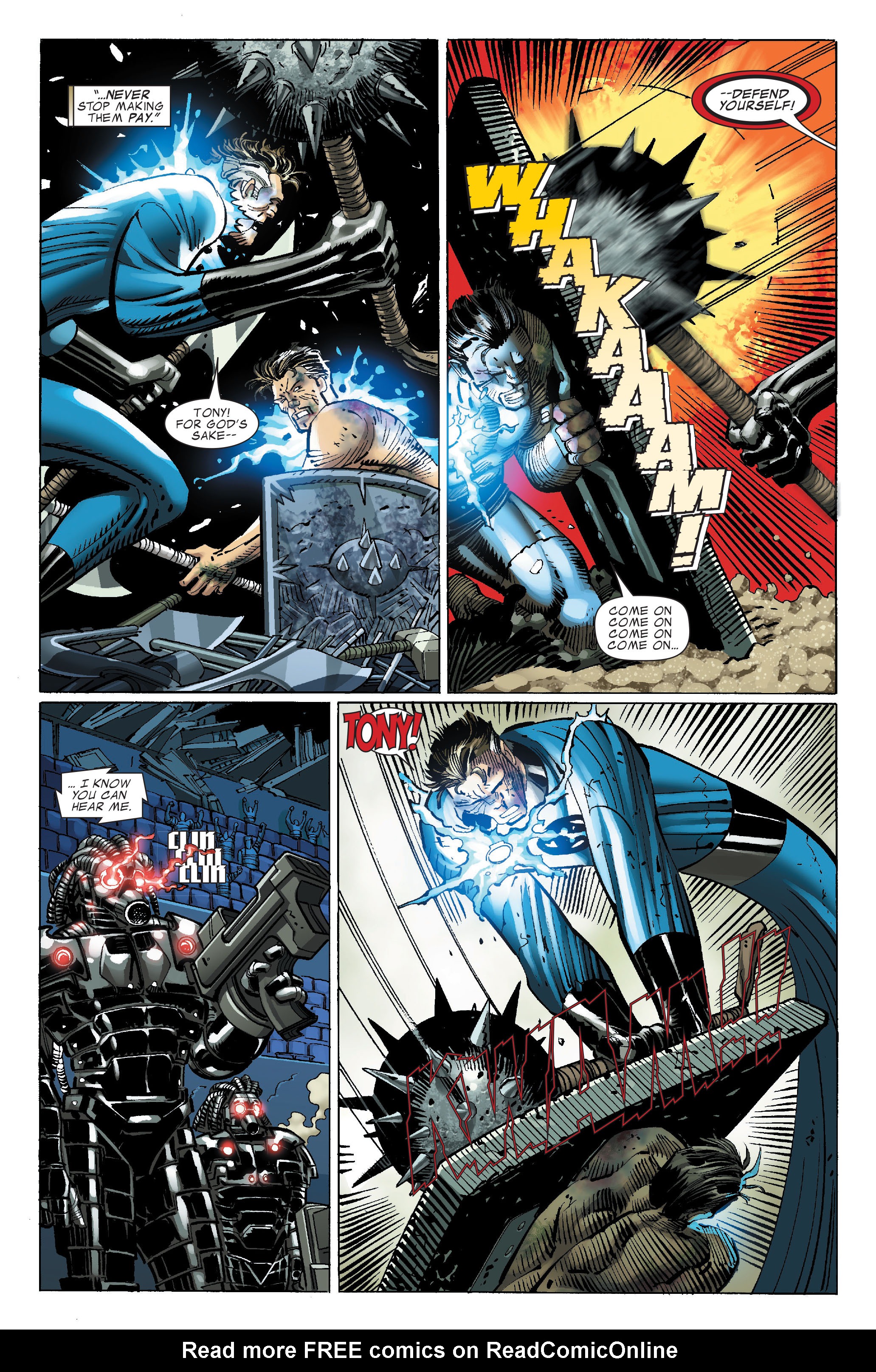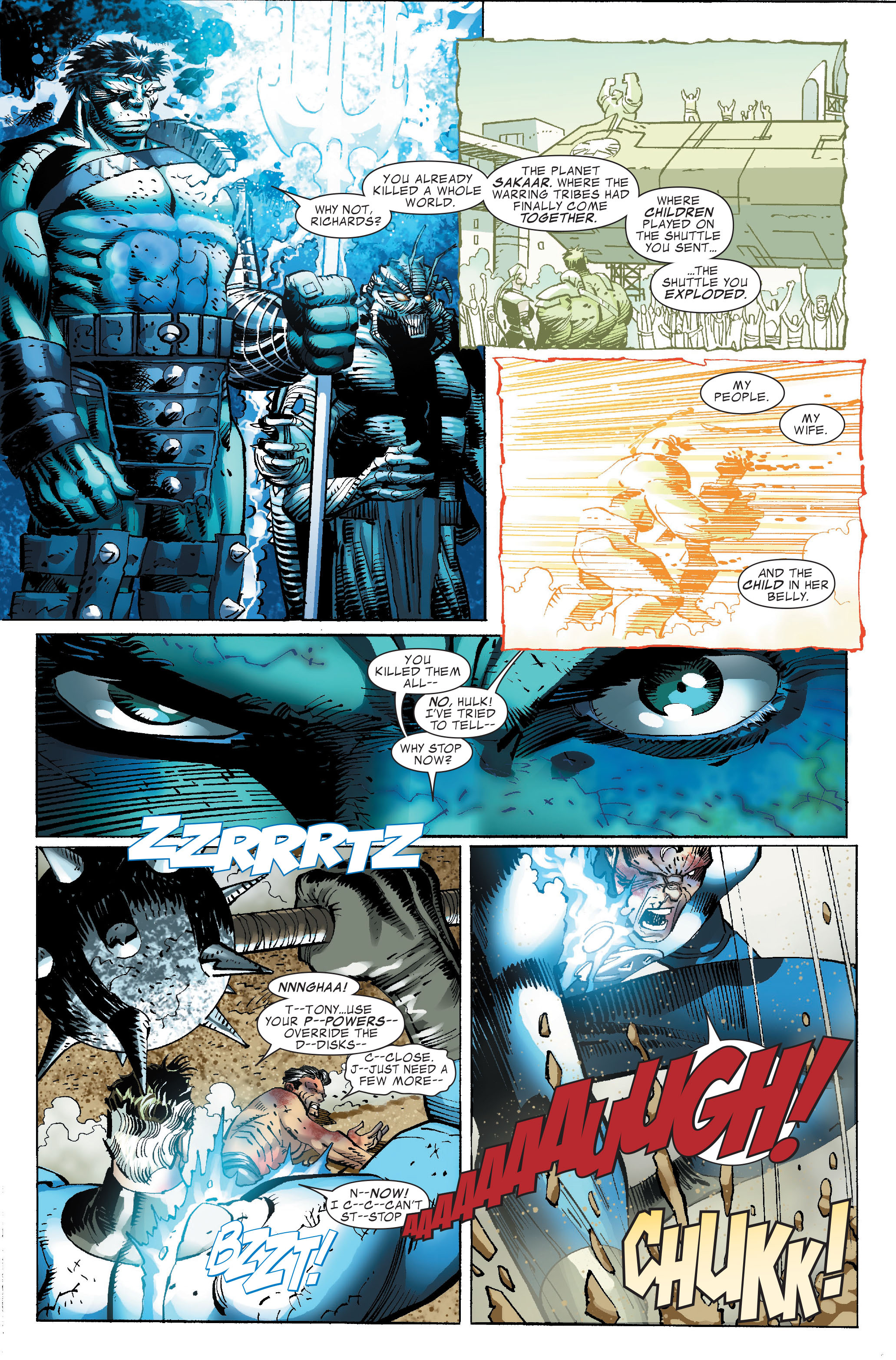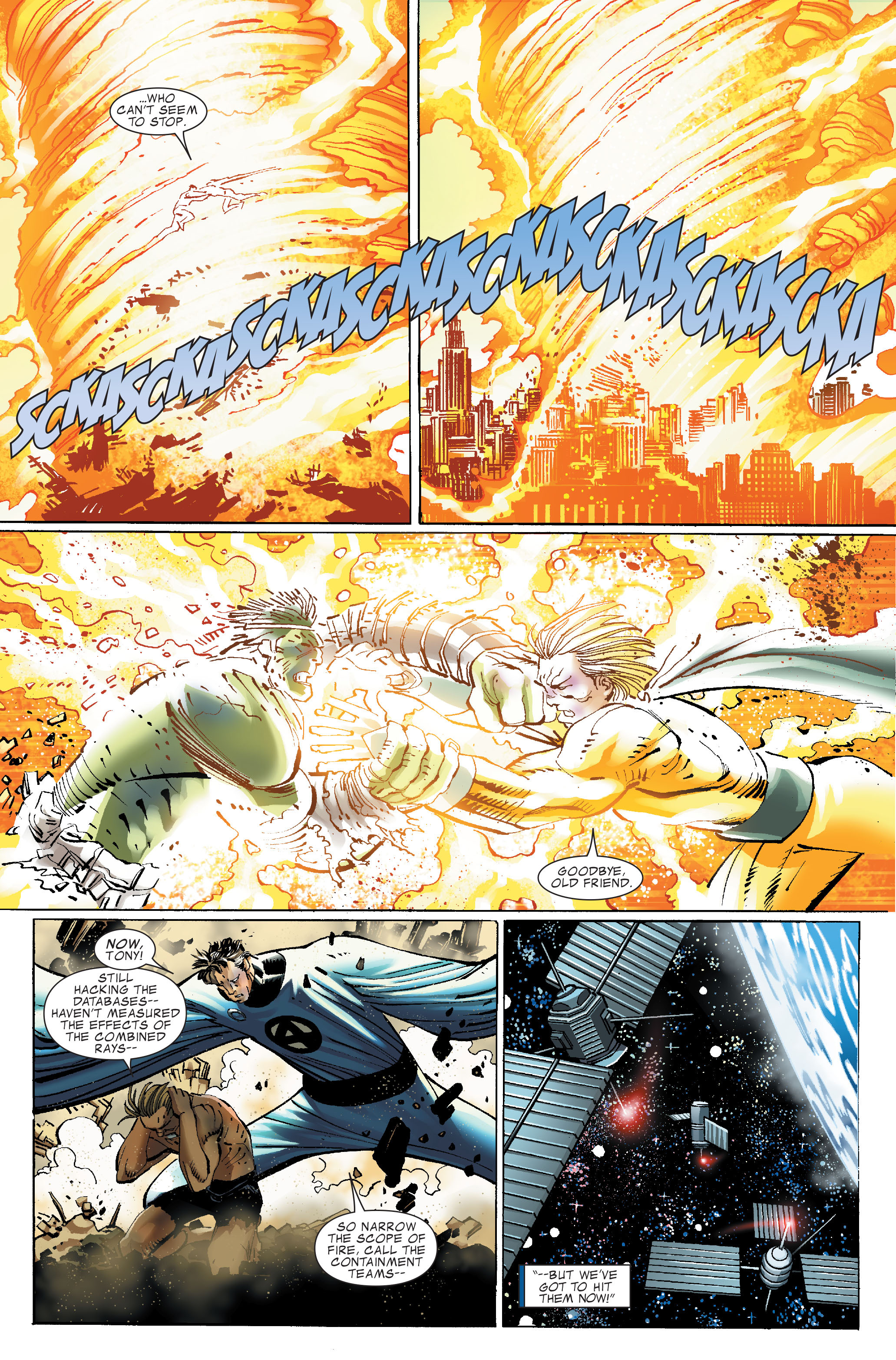 Reed cố gắng chống lại chiếc đĩa nhưng không thể, anh bắt buộc phải ra tay. Do trấn động từ trận chiến với Hulk, Tony không thể tự vệ được và Reed bắt đầu vung tay xuống.