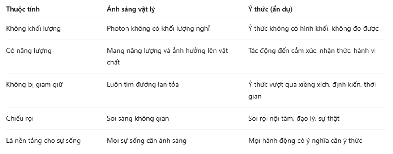 => Điều này cho thấy ánh sáng không chỉ là vật lý, mà còn là ẩn dụ cổ xưa cho sự hiện diện tinh thần – cho chính ý thức.