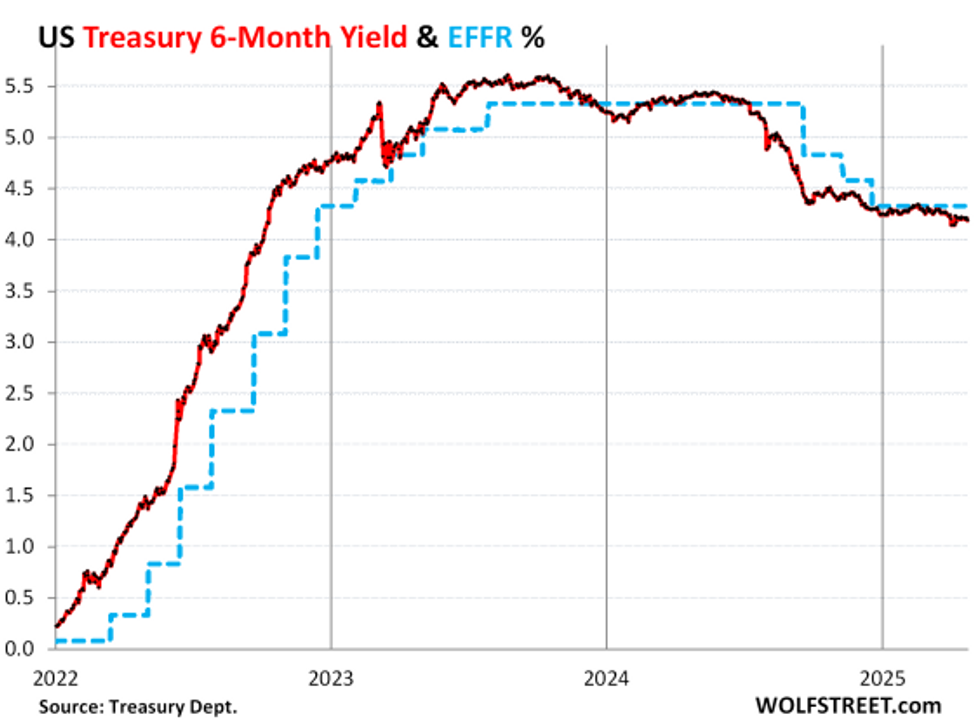 Cần lưu ý rằng, trong giai đoạn hiện tại, lợi suất ngắn hạn (short-term yield) từ 1-6 tháng vẫn bám chặt với Effective Federal Funds Rate (EFFR). Điều này cho thấy xác suất Fed sẽ cắt giảm lãi suất trong mùa hè năm nay là rất thấp.