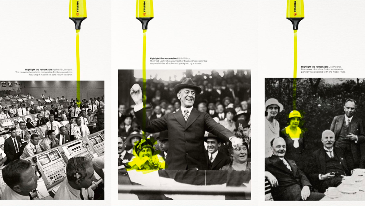 đôi khi, quảng cáo không cần đao to búa lớn. chiến dịch của hãng bút dạ quang Stabilo là minh chứng cho việc ý tưởng lớn đến từ chức năng đơn giản nhất của sản phẩm. họ dùng chiếc bút màu vàng rực để tô đậm những người phụ nữ bị "lấp bóng" trong các bức ảnh lịch sử: